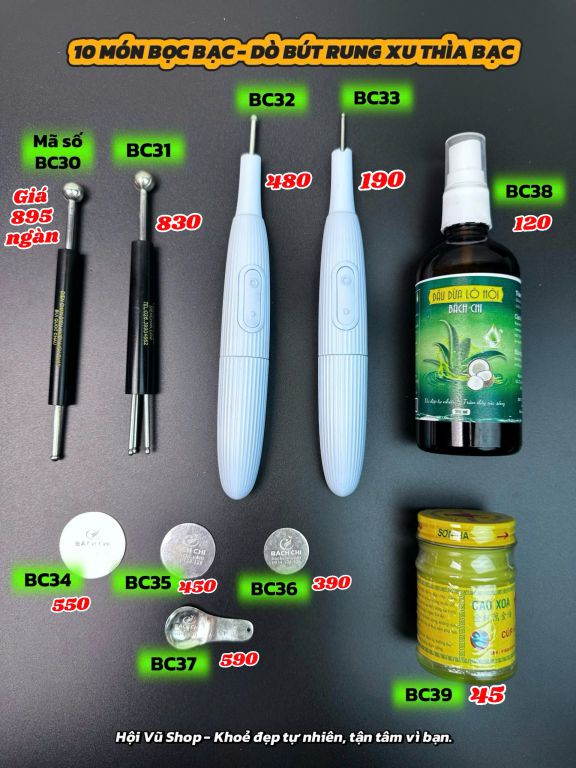 + Các loại dò Diện Chẩn bọc bạc, bút rung bọc bạc, xu thìa bạc, kèm dầu dừa, cao nóng